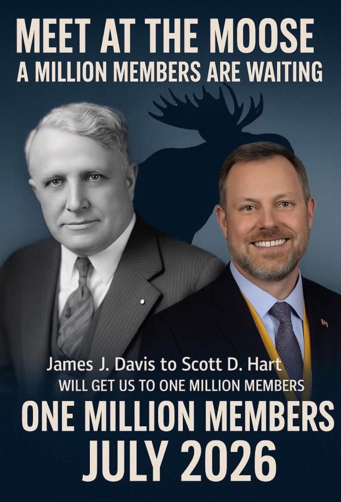 The Loyal Order of Moose is a fraternal and service organization. It was founded in 1888 by James J Davis. Now, the organization is led by Scott D Hart. With almost one million members in roughly 1,600 Lodges in 49 states and four Canadian provinces, plus Great Britain. The Loyal Order of Moose, along with other units of Moose International, supports the operation of Mooseheart Child City & School. This is a 1,000-acre community for children and teens in need, located 40 miles west of Chicago. It also supports Moosehaven, a 70-acre retirement community for its members near Jacksonville, FL. Additionally, members of the Moose conduct approximately $70 million worth of community service (counting monetary donations and volunteer hours worked) annually. The Loyal Order of Moose organizes and participates in numerous sports and recreational programs, in local Lodges and Family Centers in the majority of 44 State and Provincial Associations, and on a fraternity-wide basis. Lodges across the Fraternity are known for creating life-long bonds between members through activities and a shared concern for children in need, seniors and the communities in which they live.