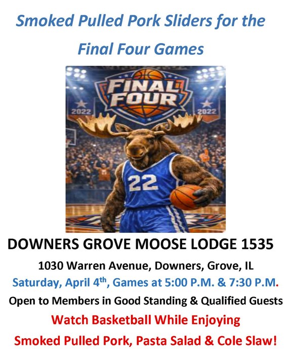 Election night for the Lodge’s next Board of Officers will be on April 14, between 4:30-6:30 pm. Current Downers Grove Moose members can vote anytime during that period in the Meeting/Kids’ Room. Membership cards are required. One contested position will appear on the ballet. The new Board will officially take office on May 1st.