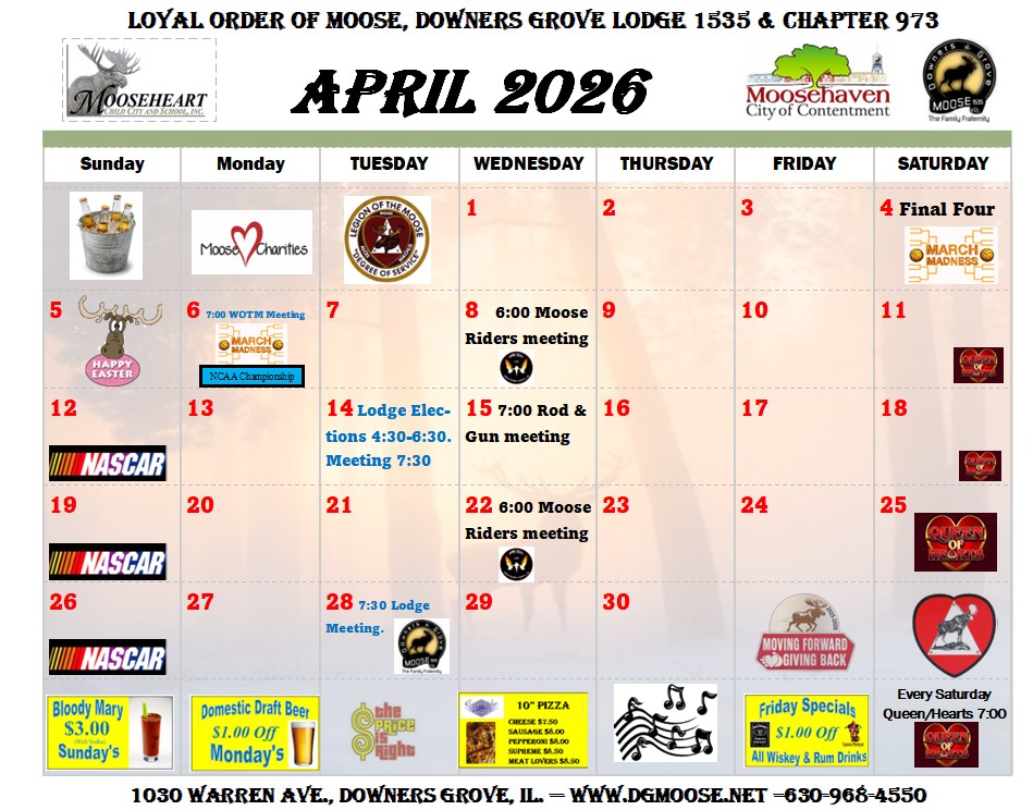 Election night for the Lodge’s next Board of Officers will be on April 14, between 4:30-6:30 pm. Current Downers Grove Moose members can vote anytime during that period in the Meeting/Kids’ Room. Membership cards are required. One contested position will appear on the ballet. The new Board will officially take office on May 1st.