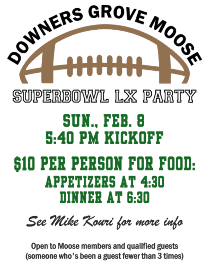 Save the date for the Annual Moose Superbowl Party on Feb. 8. More details: